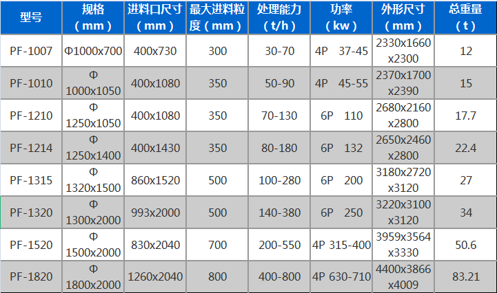 | 型號 | 規(guī)格(mm) | 進(jìn)料口尺寸(mm) | 最大進(jìn)料粒度(mm) | 處理能力(t/h) | 功率(kw) | 外形尺寸(mm) | 總重量(t) |