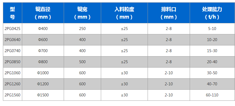 對(duì)輥機(jī)由輥輪組成、輥輪支撐軸承、壓緊和調(diào)節(jié)裝置以及驅(qū)動(dòng)裝置等部分組成,結(jié)構(gòu)簡(jiǎn)單、占用空間小,常用有2PG0640、2PG0740、2PG0850、2PG1260等型號(hào)。